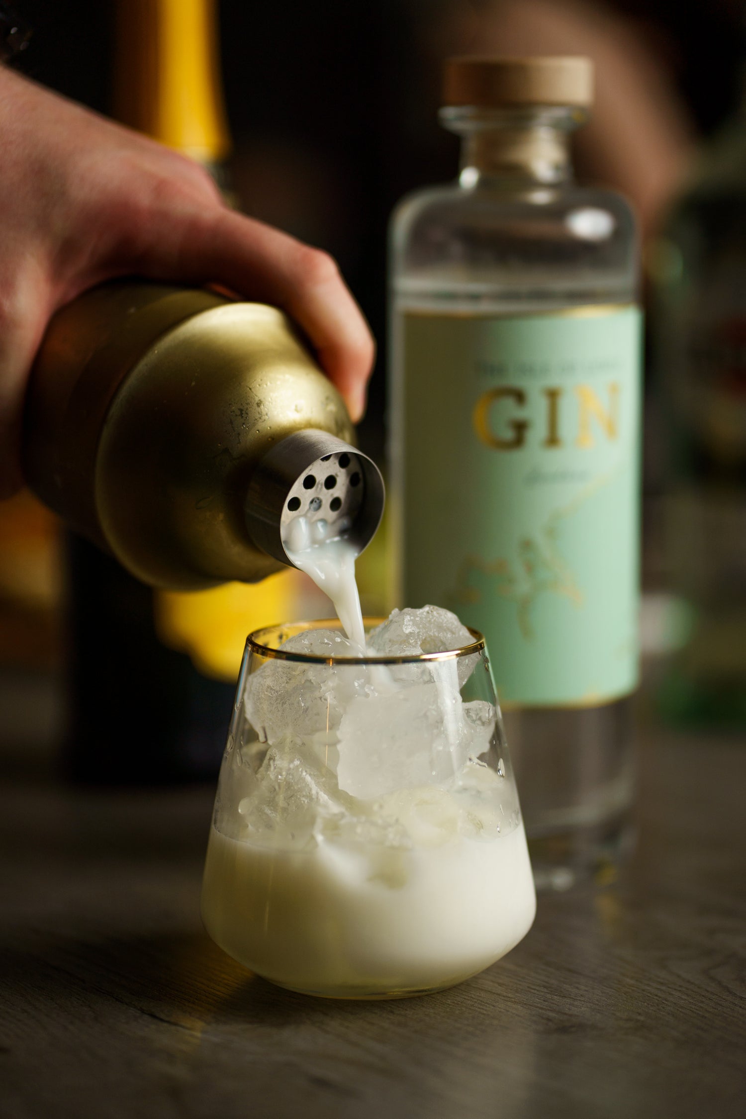 - Dry shake (shake without ice) the gin, Cointreau, lemon juice, sugar syrup, and cream in a cocktail shaker.